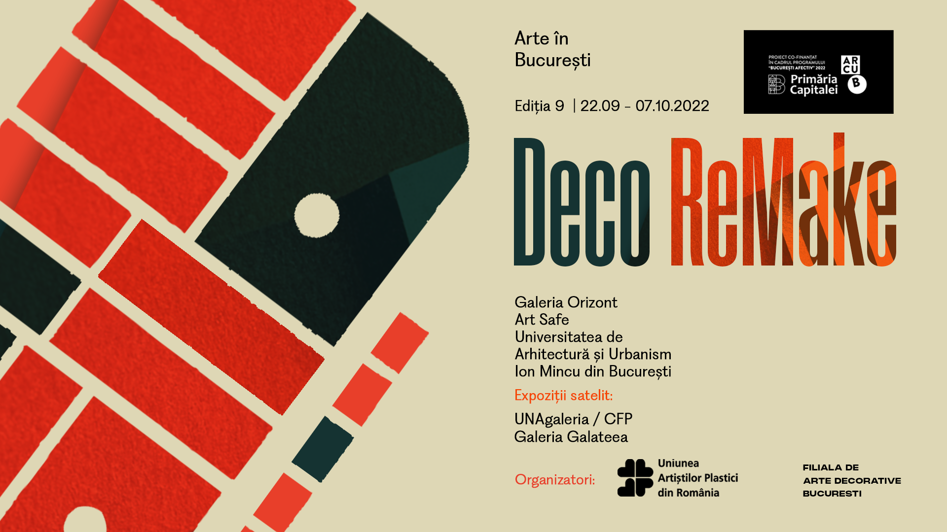 Proiectul Arte în București 2022 (a noua ediție)- Deco ReMake - realizat de către Uniunea Artiștilor Plastici din România (UAP) și Filiala Arte Decorative a UAP, alături de partenerii- Universitatea Națională de Arte București, Universitatea de Arhitectură și Urbanism „Ion Mincu” și Art Safe - pune anul acesta accentul pe importanța reinventării industriilor creative, aducând în prim-plan diveritatea de tehnici din artele decorative. Proiectul este co-finanțat de Primăria Municipiului București prin ARCUB, în cadrul Programului București afectiv 2022*.