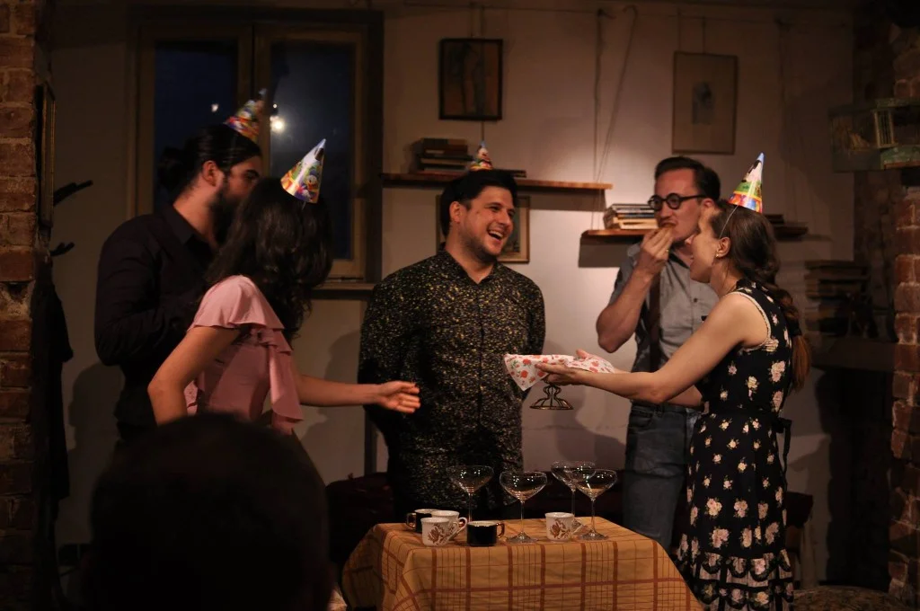 Timp de o oră jumătate, spectatorii au asistat într-un spațiu foarte intim (demisolul Dianei 4 a fost transformat în sală de teatru de tip studio), la povestea dură și foarte actuală a Elenei Sergheevna, o profesoară de matematică îmbătrânită prea devreme. Elevii de vârsta bacalaureatului îi fac o surpriză de ziua ei, vin la doisprezece noaptea cu flori, confetti, șampanie și cadouri.