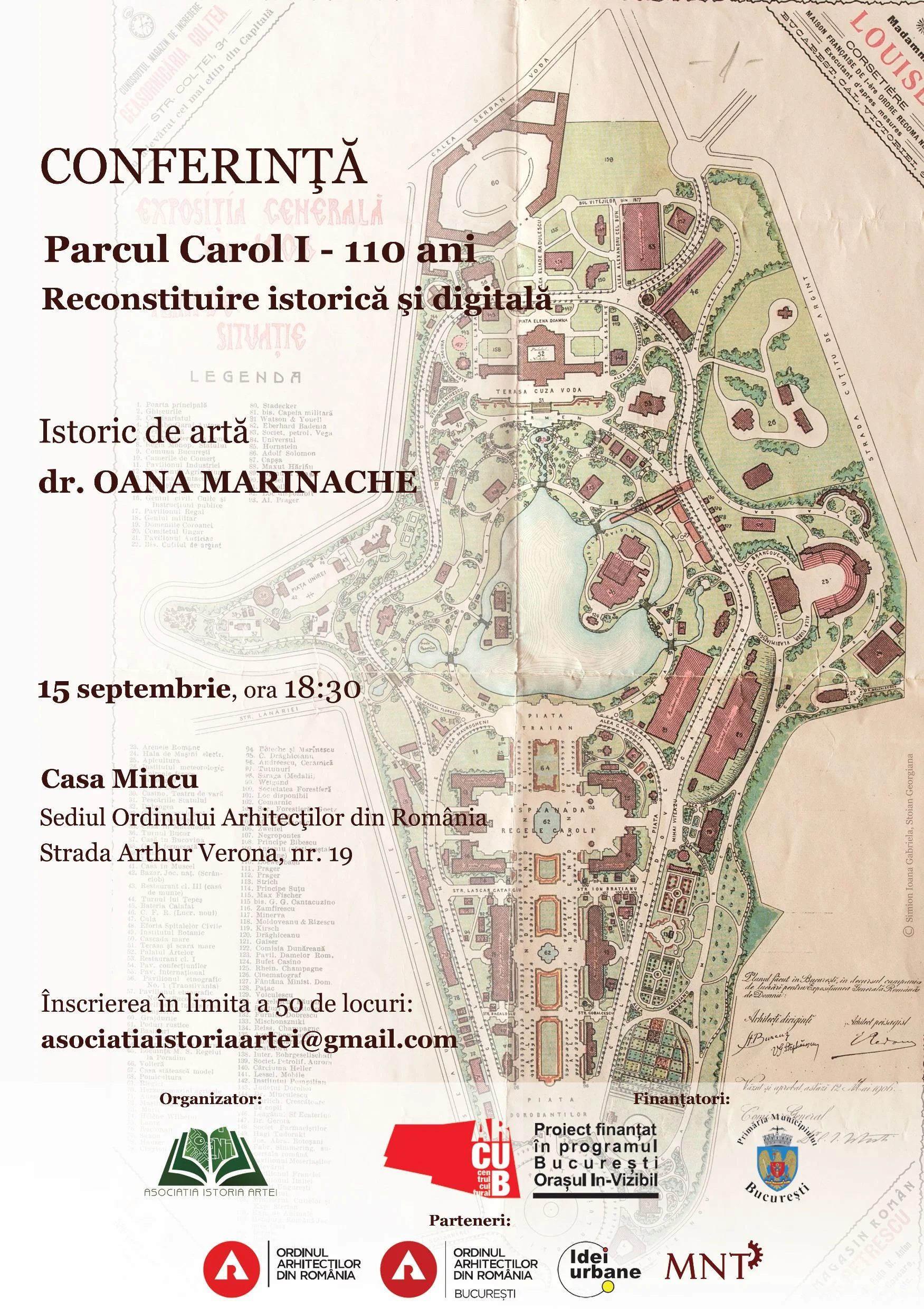 Asociația Istoria Artei organizează un dublu eveniment la Casa Mincu, sediul Ordinului Arhitecților din România, din str. Arthur Verona nr. 19, în 15 septembrie, începând cu ora 18:30. Cu acest prilej prezentăm publicului expoziția de fotografii de epocă, documente de arhivă și din periodicele vremii, cărți poștale, precum și reconstituirile digitale ale unor pavilioane ale Expoziției Generale Române din 1906. Cele 30 de panouri prezintă elementele cele mai importante ale cercetării echipei proiectului „Parcul Carol I – 110 ani” și au fost realizate cu sprijinul financiar al Ordinului Arhitecților din România, din „Timbrul Arhitecturii”.