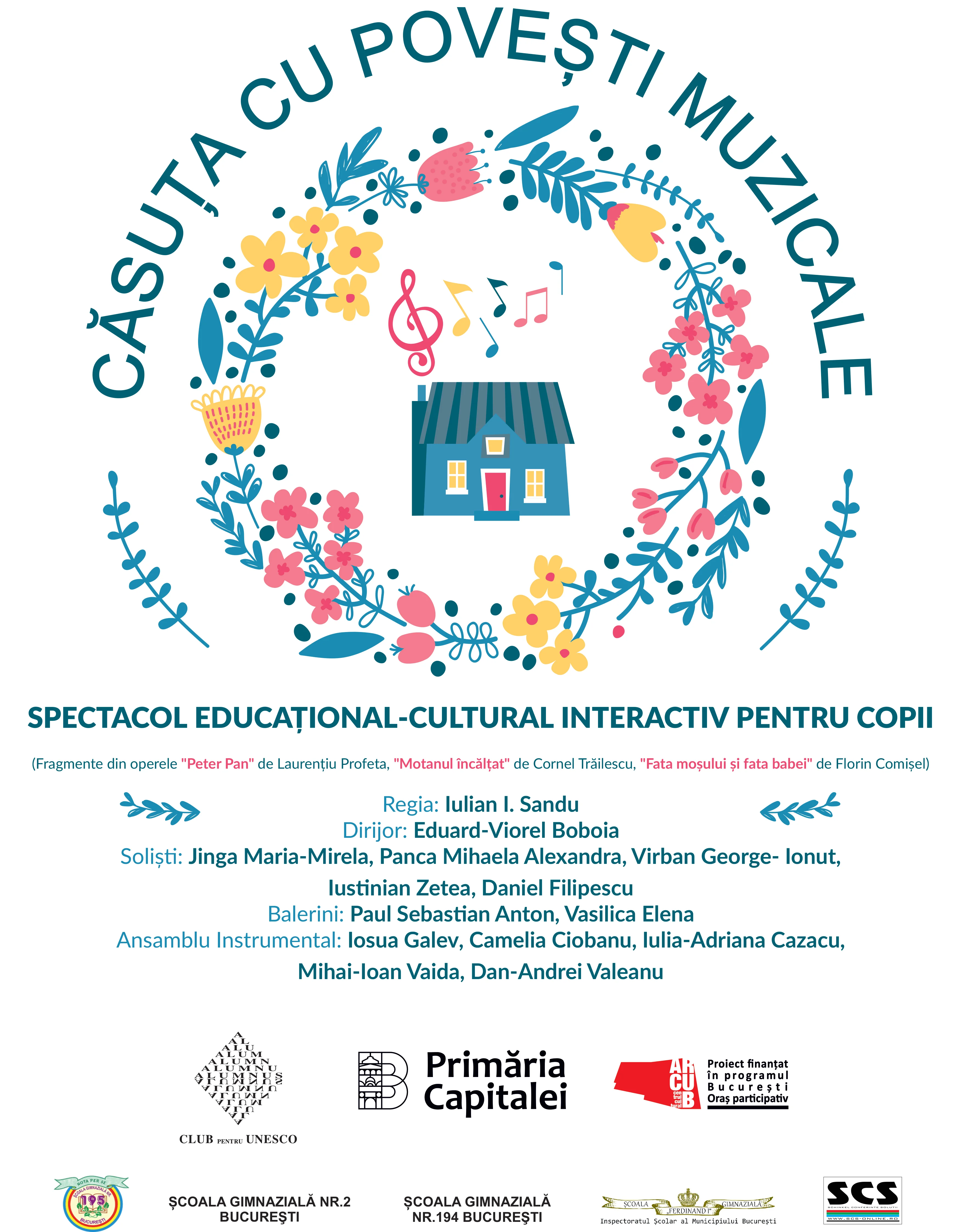 Acest proiect cultural este  finanțat în cadrul Programului cultural București Oraș participativ de catre Primaria  Municipiului Bucuresti prin Centrul Cultural al Municipiului Bucureşti ARCUB.Pentru mai multe informatii despre proiect: Elena Vasilica, 0748.100.288 si pe pagina de Facebook a proiectului “Casuta cu Povesti Muzicale” si http://alumnus-unesco.club/casuta-cu-povesti-muzicale-bucuresti/